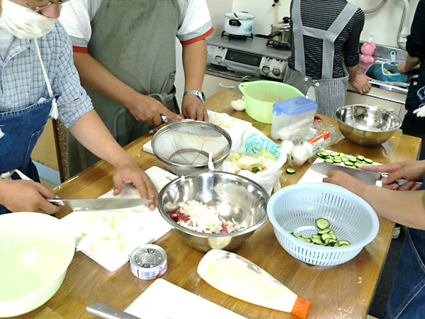 昼食づくりや創作活動、レクリエーション等を通して、仲間づくりや生活リズムを整えていくことを目的としています。創作活動では、主にくるみボタンを使った小物づくりをしています。